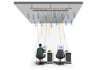 Continuous chilled ceilings and (convective) cooling panels used as rafts absorb heat energy from the room air and transfer it to the chilled water. Convective chilled ceilings are made up of cooling panels in an open design with regular gaps. Convective chilled ceilings (and also continuous chilled ceilings) operate according to radiation and convection principles. The heat radiated from the room is absorbed on the lower surface of the panels. The warm room air near the ceiling comes into contact with the wave-shaped blades that are carrying chilled water. The air is cooled as a consequence and then, due to the difference in density when compared to the warmer air, descends slowly back to the occupied zone. This ensures a high comfort level for room occupants as there are no draughts. As the cooling panels for convective chilled ceilings are installed in an open arrangement (with gaps) below the ceiling slab, the room air comes into contact also with the upper surface of the wave-shaped blades. This construction and installation type results in increased convection when compared to continuous radiant chilled ceilings and in a higher cooling capacity. The special shape of the panels allows for the best possible cooling capacity. The largest proportion of the cooling capacity is provided by convection (approx. 70%). The remaining proportion of the cooling capacity is provided by radiation.